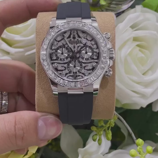 Rolex stunned the watch world at Baselworld with the unveiling of the Cosmograph Daytona Eye of the Tiger, a dazzling statement of power, precision, and prestige. This men’s white gold chronograph with a diamond bezel design is crafted for those who value bold luxury and flawless performance.