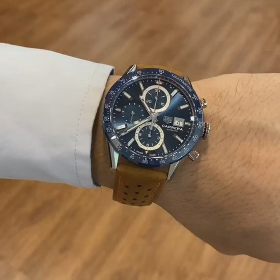 Experience the TAG Heuer Carrera Chronograph with a 42mm case, deep blue dial, brown leather strap, and reliable Japanese quartz movement. Luxury men’s watch with 6-month seller warranty. Cash on Delivery available across India.