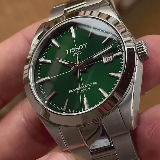 Discover the Tissot Gentleman Powermatic 80 Silicium with a bold green dial, premium steel strap, butterfly clasp, and scratch-resistant crystal glass. A luxury men’s watch at an unbeatable price.